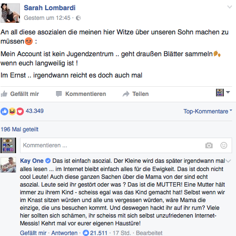 The insults do not stop. Sarah Lombardi is in the network is still hate object number one. But a celebrity man takes you suddenly to the public in the protection, like a knight in front of you: Rapper Kay One 32!